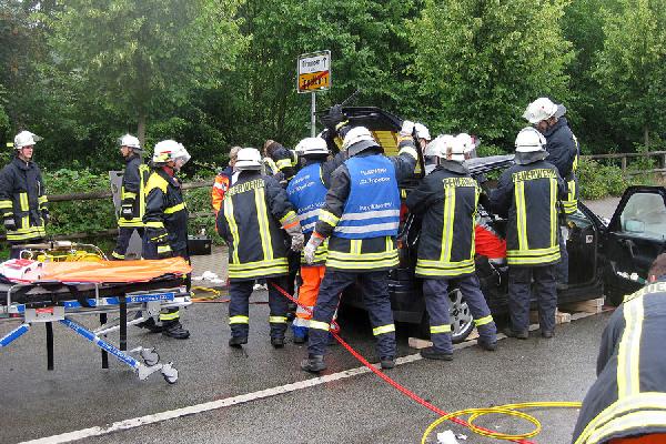 Da aufgrund der Beschwerden und dem Verletzungsmuster der Verdacht auf eine Wirbelsäulenverletzung bestand, entschied sich der inzwischen eingetroffene Notarzt für eine aufwendige, aber möglichst schonende Rettung der Patientin. Dafür wurden von der Feuerwehr die hinteren Seitentüren mit hydraulischen Werkzeugen abgetrennt und das Dach des Fahrzeugs abgenommen. Erst dann konnte die ältere Dame aus dem Fahrzeug befreit werden.