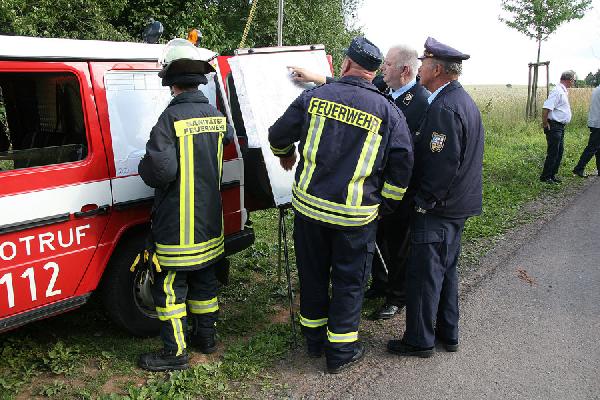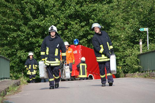 Die Schwierigkeit dabei war, dass die An- und Abfahrt der großen Löschfahrzeuge koordiniert werden musste, da auf der schmalen Zufahrtstraße ein Begegnungsverkehr nicht möglich war. Der Löschbezirk Dörsdorf hatte dazu einen eigenen Einsatzabschnitt gebildet und dirigierte die 5 Tankfahrzeugen per Funk durch das Nadelöhr.