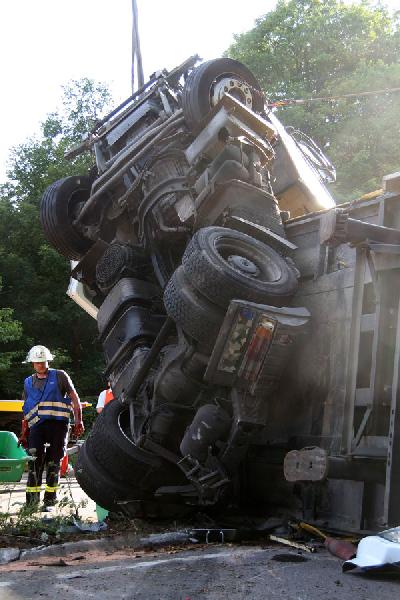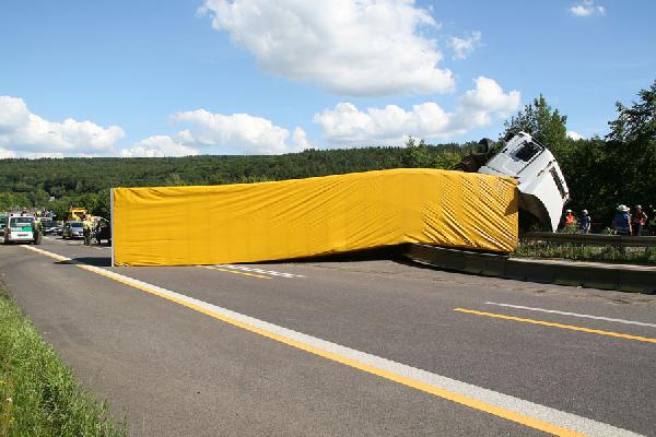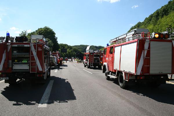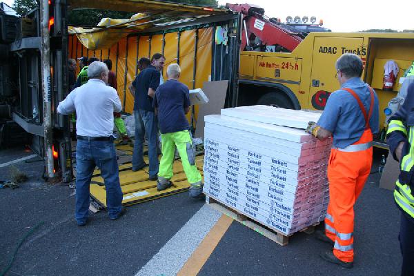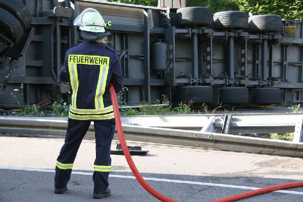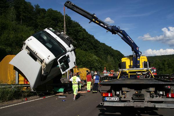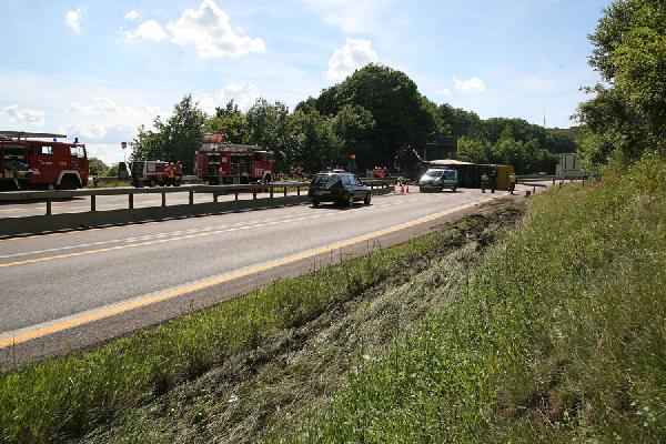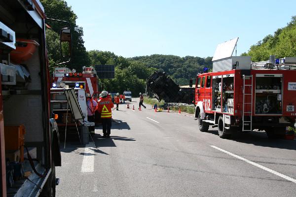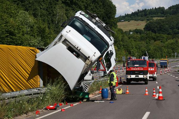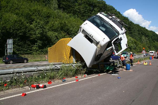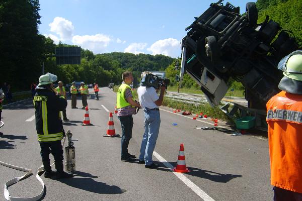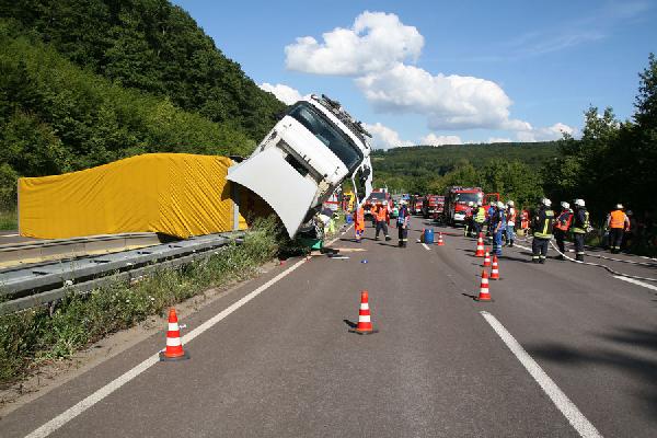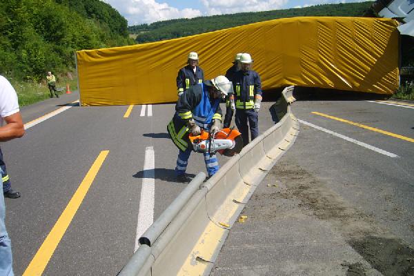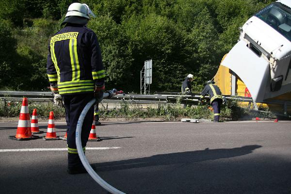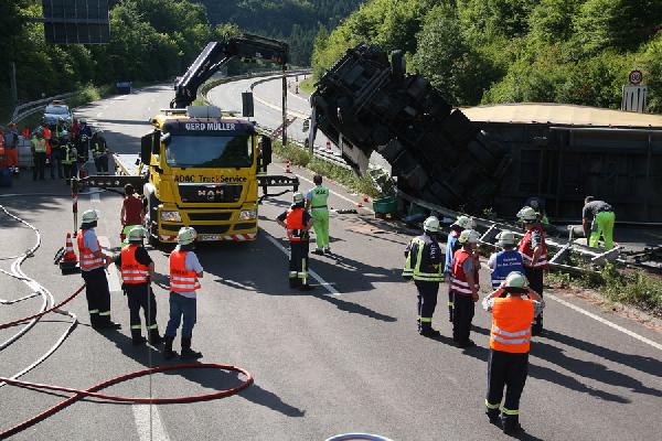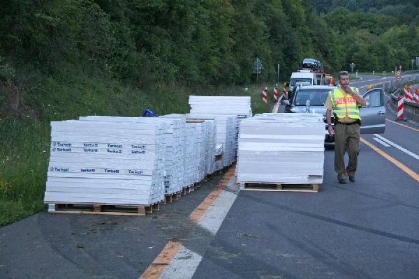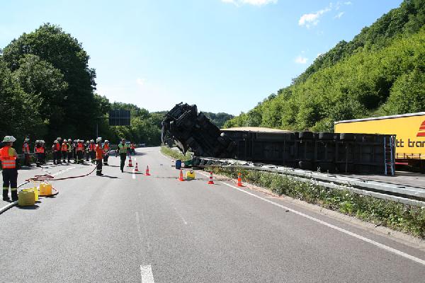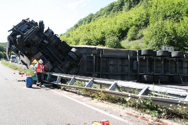 Eppelborn. Kurz hinter der Anschlussstelle Eppelborn ereignete sich am Nachmittag des 11. Juli 2011 ein schwerer Verkehrsunfall: Der Fahrer eines Sattelzugs, der die Autobahn in Fahrtrichtung Trier befuhr, war kurz vor einem Baustellenbereich nach rechts auf unbefestigtes Grün von der Fahrbahn abgekommen und ins Schlingern geraten. Bei dem Versuch, das Fahrzeug wieder auf die Fahrbahn zu lenken, schaukelte sich der mit 23t Laminatpanelen beladene Auflieger hoch und brachte Zugmaschine und Auflieger zum Umstürzen. Das Fahrzeug blieb dabei quer zur Fahrtrichtung liegen und versperrte alle vier Fahrspuren im Baustellenbereich.