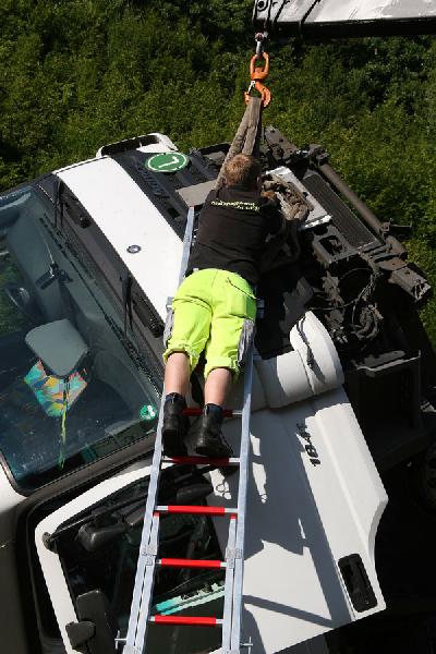 Der Fahrer hatte dabei großes Glück: Er konnte sich unverletzt und aus eigener Kraft aus dem Führerhaus, das senkrecht in den Himmel ragte, befreien. Der Fahrer eines entgegenkommenden Lastzugs erkannte die Situation schnell und konnte rechtzeitig vor der Unfallstelle zum Stehen kommen. Weitere Fahrzeuge wurden nicht in den Unfall verwickelt.