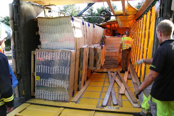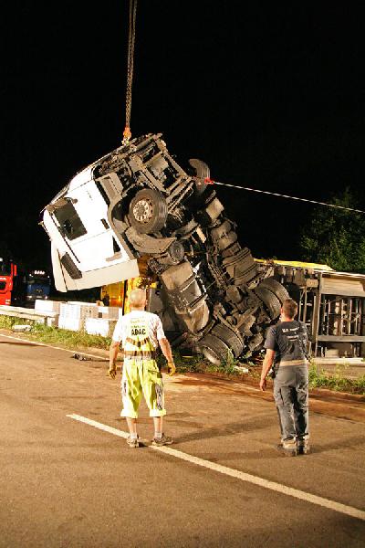 Die anschließende Bergung erwies sich als sehr zeitaufwändig: Bevor das Fahrzeug wieder aufgerichtet werden konnte, musste der Auflieger zuerst entladen werden. Dies ging nur in mühevoller Handarbeit, bei der Paket für Paket nach draußen gebracht wurde und dort wieder auf Paletten gestapelt werden konnte. Da sich die Bergungsarbeiten durch die einsetzende Dunkelheit erschwerten, wurde die Feuerwehr im Amtshilfe noch zur Ausleuchtung eingesetzt. Unterstützung kam dabei in Form eines Beleuchtung-Gerätewagens der Bereitschaftspolizei aus Saarbrücken.