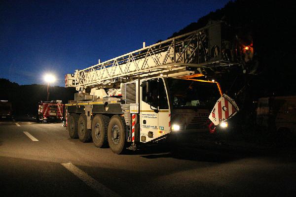 Die Einsatzkräfte unterstützten das Bergungsunternehmen dann bei der Demontage der Leitplanken im Unfallbereich. Dazu mussten die Pfosten mit dem Motortrennschleifer durchtrennt werden. Da bei den Schneidarbeiten wegen dem ausgetretenen Kraftstoff Brandgefahr bestand, wurde die Einsatzstelle mit mehreren Rohren durch die Feuerwehr gesichert.