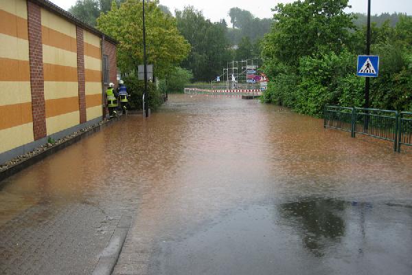 Doch dann ging es Schlag auf Schlag: Immer Notrufe über überflutete Straßen und vollgelaufene Keller gingen bei der Feuerwehr ein. Mehr als 35 Liter Regen fielen dabei in einer halben Stunde pro Quadratmeter. Dadurch waren nicht nur Regenrinnen überlastet: Die Kanalisation konnte die Fluten nicht mehr bewältigen, so dass es zu Wasseraustritt aus Toiletten und Kanaleinläufen kam. Sogar die schweren gusseisernen Kanaldeckeln wurden an manchen Stellen durch den großen Druck aus ihrer Verankerung gehoben.