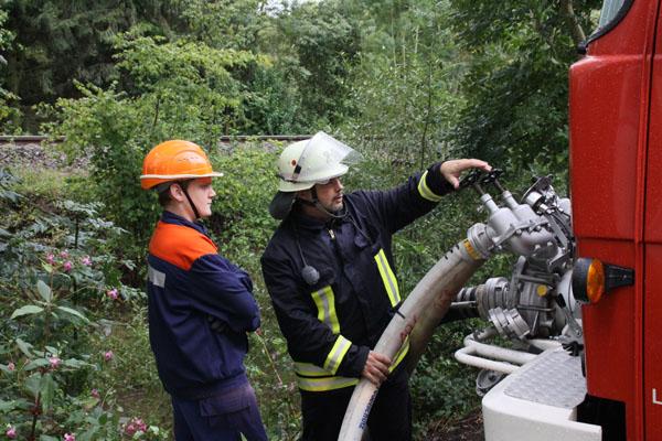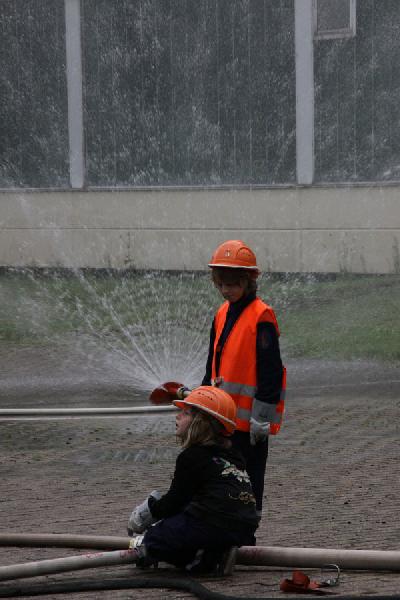 Doch die Jugendlichen ließen sich nicht von dem Starkregen und dem aufkommenden Hagel beeinflussen und versuchten, dem Unwetter standzuhalten. Tapfer wurden die Strahlrohre in Richtung des angenommenen Feuers gehalten. Nach kurzer Zeit mussten die Verantwortlichen Übungsleiter dann doch einschreiten und die Anzeige Übung unterbrechen.