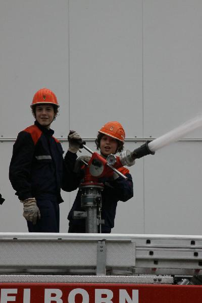 Nachdem der Wolkenbruch vorüber war, wollten die Jugendlichen unbedingt weitermachen. "Wir haben alles aufgebaut und jetzt wollen wir auch spritzen, Nass sind wir sowieso", so der einhellige Tenor der Truppe. Sie ließen es sich dann auch nicht nehmen, den Gästen der Übung ihr Können zu zeigen. Nur die Jugendfeuerwehr aus Wiesbach musste alles schnell zusammenpacken. Ihr Fahrzeug wurde zu einem realen Unwettereinsatz abgezogen.