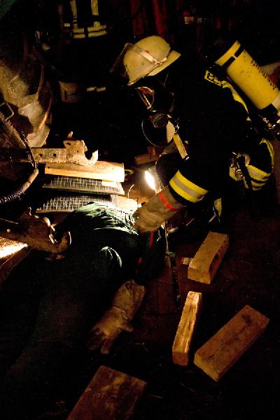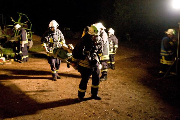 Mehrere Szenarien gleichzeitig mussten dabei von den 33 Einsatzkräften bewältigt werden: In einem Gebäude des Hofes wurde ein Brand angenommen. In den völlig verqualmten Räumen galt es, vor der eigentlichen Brandbekämpfung eine noch vermisste Person zu finden und ins Freie zu retten. Ausgerüstet mit Atemschutzgeräte und durch die starke Verqualmung keine leichte Aufgabe für die Feuerwehrleute. Zeitgleich musste auch der Löschangriff vorbereitet werden.