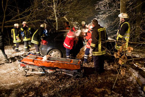 Nach dem Eintreffen wurde die im Dunkeln liegende Einsatzstelle mit Scheinwerfern ausgeleuchtet und die Fahrzeugbatterie abgeklemmt. Der inzwischen ebenfalls eingetroffene Notarzt entschied dann nach einer Untersuchung des Patienten, dass aufgrund des Verletzungsmusters keine technische Rettung erforderlich war. Der Patient konnte mit Unterstützung der Feuerwehr aus dem Fahrzeug befreit und zum Rettungswagen gebracht werden.