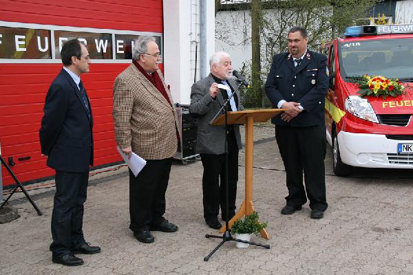 Bei der offiziellen Übergabe der Räumlichkeiten und der neuen Fahrzeuge lobte Bürgermeister Fritz-Hermann Lutz das große Engagement des Löschbezirkes und die vorbildliche Zusammenarbeit zwischen DRK und Feuerwehr Habach bei der Umsetzung des Bauprojektes. Im Anschluss an seine Rede segnete Pastor Matthias Marx die neuen Fahrzeuge und die Räumlichkeiten und bat für himmlischen Schutz bei allen Einsätzen.