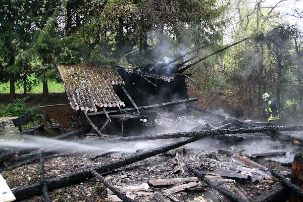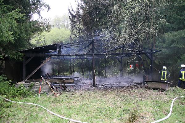 Immer wieder loderten Glutnester unter den Trümmern auf und mussten abgelöscht werden. Die Nachlöscharbeiten zogen sich noch bis gegen 10:00 Uhr hin. Die Hütte brannte durch das Feuer komplett nieder, eine Brandausbreitung und die Entwicklung eines Waldbrandes konnte durch den schnellen Einsatz der Feuerwehr verhindert werden. Die baufälligen Reste drohten einzustürzen und wurden von den Einsatzkräften niedergerissen.