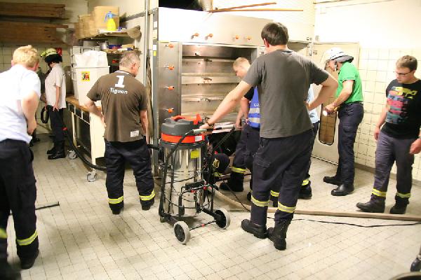 Infolge der großen Hitze kam es dann am Nachmittag im Bereich eines Ventils zu einem größeren Wasseraustritt, der für die Dampfentwicklung sorgte. Die Feuerwehr schloß den Hauswasseranschluss und nahm das ausgetretene Wasser mit großen Saugern auf. Auch die unter der Backstube liegenden Kellerräume waren vollgelaufen und mussten ausgepumpt werden.