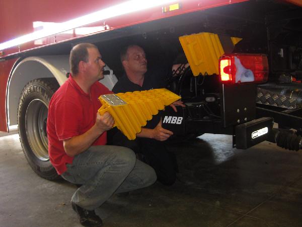 Das von der Wehrführung und Verwaltung entsandte dreiköpfige Abnahmeteam der Feuerwehr Eppelborn, (u. a. mit einem Kfz-Meister und dem hauptverantwortlichen Gerätewart) hatte nun die Aufgabe, die in den Ausschreibungsunterlagen geforderten Positionen zu überprüfen. Zwei Arbeitstage waren nötig, um das Fahrgestell mit der Ausschreibung zu vergleichen und den Aufbau zu kontrollieren. Der Aufbau, bestehend aus einem festem Koffer, zwei Geräteräumen für die Aufnahme der Ausrüstung und einer zweigteilten Ladebordwand soll auf der Ladefläche maximal acht Rollcontainer aufnehmen können. Standardmäßig werden vier davon mit je 500 Meter Schlauchmaterial ständig verlastet sein. Funktionalität und passgenauigkeit der bestellten Rollcontainer wurden mit dem Verlade-, Verzurr- und Sicherungssystem des Fahrzeugaufbaues abgeglichen.