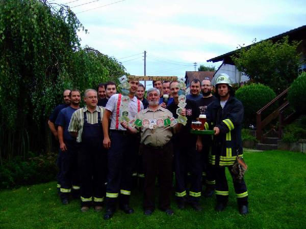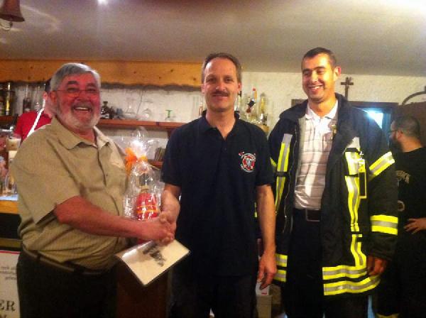 Die Löschbezirksführung, Bernd Detzler und Markus Lambert, überbrachten Herbert eine kleine Überraschung und die Glückwünsche der Kameraden, die bereits im Garten auf Ihn warteten. Denn bevor es zu einem kleinen Umtrunk zu Herbert ging war vorher noch eine Übung angesetzt.