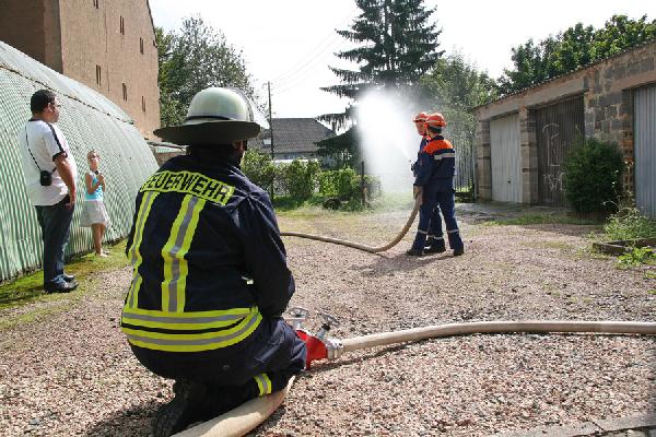 Routiniert und schnell wie die Großen bauten die Jugendfeuerwehrleute die Wasserversorgung auf, rollten Schläuche aus und begannen mit dem Löschangriff. Hier konnte sie zeigen, was sie im vergangenen Jahr in zahlreichen Übungsstunden gelernt und trainiert hatten. Schnell war Wasser an den ersten Rohren, und der imaginäre Brand konnte bekämpft werden.