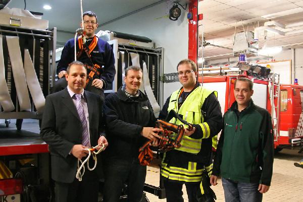 Um ein Herunterfallen der Einsatzkräfte dabei zu vermeiden, müssen diese ordnungsgemäß gesichert werden. Mit den beiden jetzt übergebenen sogenannten "Auffanggurten zur Standplatzsicherung" mit Halteseilen, die Martin Schäfer an Löschbezirksführer Dr. Frank Schwan und seinen Stellvertreter Sascha Müller übergeben hat, wird die Ausrüstung des Fahrzeug sinnvoll ergänzt.