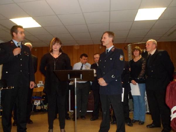 Nach dem Wehrführer ergingen vom Beigeordneten der Gemeinde Eppelborn, Werner Michel, ebenfalls lobende Worte an die Feuerwehrleute aus Dirmingen. Als letzter Redner ergriff unser Ortsvorsteher Manfred Klein das Wort und er sagte die ganze Unterstützung des Ortsrates von Dirmingen für die Belange der Feuerwehr zu. Der stellvertretende Löschbezirksführer Markus Lambert ergriff das Mikrofon und zitierte Nadja und Bernd Detzler auf die Bühne. Markus Lambert überreichte an Bernd Detzler einen Präsentkorb für 10 Jahre als Löschbezirksführer. Seine Gattin Nadja erhielt Blumen und ein Dankeschön für die Zeit, wo sie Ihren Gatten an die Feuerwehr abgeben muss. Löschbezirksführer Bernd Detzler bedankte sich und eröffnete das Buffet, dass von Kamerad und Vorstandsmitglied Heino Molter als erstes gestürmt wurde. Sicher wollte er erst testen, ob alles in Ordnung war und wir es unseren Gästen auch gredenzen können. Die Probe war gelungen und wir konnten uns alle an den sehr leckeren Speisen und Köstlichkeiten laben. Für die Musik an diesem Abend sorgte unser Uwe, der in unseren Reihen nicht wegzudenken wäre. Wie oft hat er schon als Ansager oder musikalischer Organisator seine Arbeit geleistet. Danke lieber Uwe und auch Danke an Claudia, seine Gattin, die Ihn immer darin unterstützt.