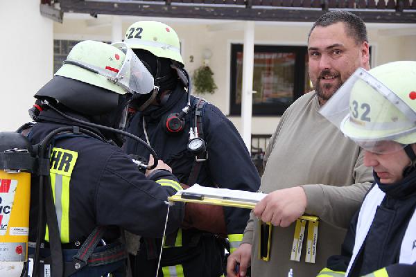 Beim Eintreffen der ersten Einsatzkräfte drang Brandrauch aus der Haustür des Zweifamilienhauses. Der Anwohner hatte das Gebäude verlassen, weitere Personen hielten sich nicht darin auf. Durch das Treppenhaus drang ein Trupp, ausgerüstet mit Atemschutzgeräten, in den stark verrauchten Keller vor und öffnete die Garagentore von innen. Das dort abgestellte Fahrzeug wurde ins Freie gebracht.