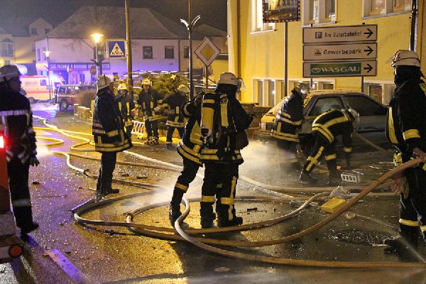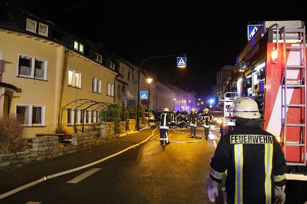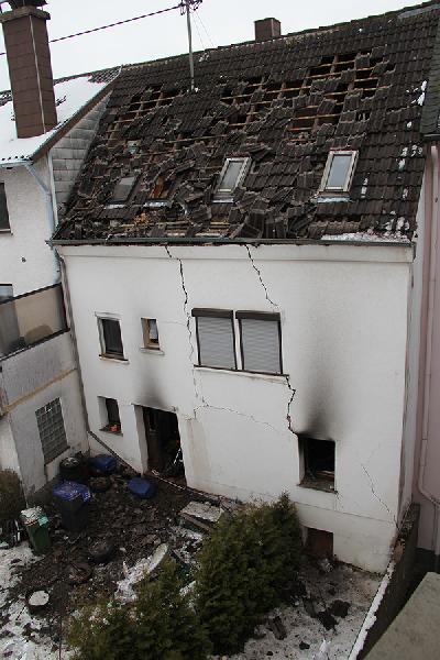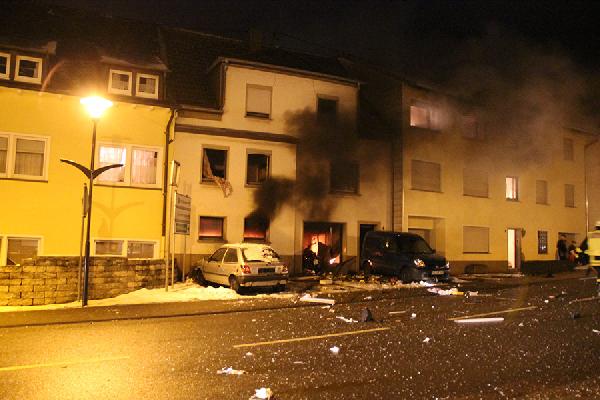 Eppelborn. Eine gewaltige Explosion riss am frühen Sonntagmorgen die Eppelborner Bevölkerung aus dem Schlaf. Fast im ganzen Ort war der gewaltige Knall zu hören. Um kurz vor sieben Uhr lief der erste Notruf bei der zentralen Leitstelle der Polizei ein. Unzählige Anrufer meldeten eine Explosion und einen Brand in einem Wohnhaus in der Dirminger Straße, der Hauptdurchgangsstraße durch die Illtalgemeinde. Das Einfamilienhaus, das direkt an das Seniorenheim Sankt Josef in der Eppelborner Ortsmitte angrenzt, brannte beim Eintreffen der ersten Feuerwehrkräfte vollständig. Die Fenster und Türen flogen durch die Druckwelle der Explosion zum Teil bis auf die andere Straßenseite und beschädigten dort parkende Autos und eine Schaufensterscheibe.