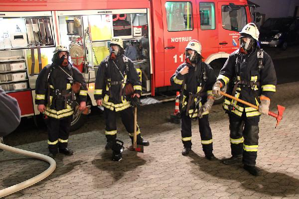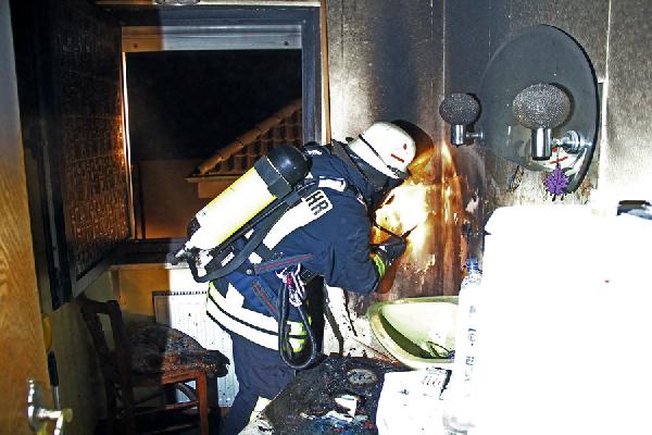 Beim Eintreffen der Feuerwehr befanden sich keine Personen mehr in dem Anwesen. Feuerschein war an einem Fenster im 1. Obergeschoss von aussen erkennbar. Ein Trupp drang mit Wärmebildkamera und Atemschutzgeräten durch das Treppenhaus in die komplett verrauchte Brandwohnung vor und konnte den Brandherd im Bad der betroffenen Wohnung lokalisieren. Es gelang ihnen schnell, das Feuer zu löschen.