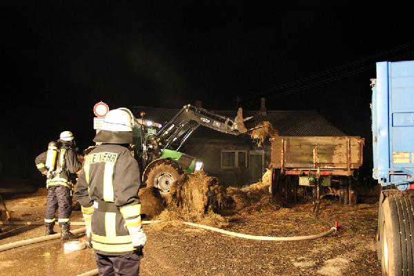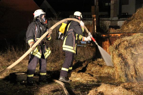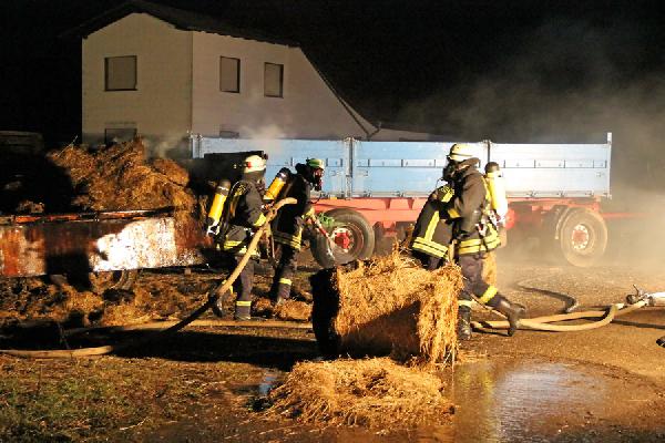 Mit Atemschutzgeräten ausgerüstet gelang es den Einsatzkräften schnell, die Flammen zu löschen und ein Übergreifen auf einen direkt daneben stehenden weiteren Anhänger zu verhindern. Um sicherzugehen, dass keine Glutnester übersehen werden, wurden die Strohballen mit einem Frontlader abgeladen, auseinander gezogen und abgelöscht. Die Löscharbeiten wurden dabei durch Kälte und starke Windböen erschwert.
