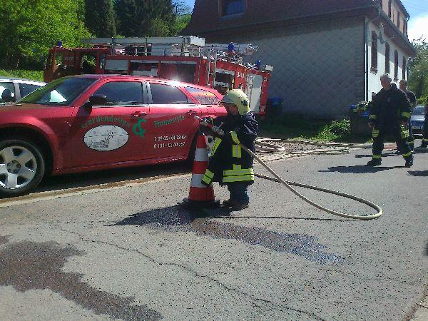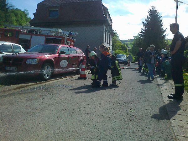 Auf der Straße "Am Render" war eine Schlauchleitung mit D-Strahlrohr aufgebaut. Hier konnten die Kinder auf ein "brennendes Haus" mit umfallenden Flammen spritzen. Leanne Lambert von der Jugendfeuerwehr stand mit am Strahlrohr und leitete die Kindergarten-Kids an. Die Kinder konnten sich nun noch die Feuerwehrfahrzeuge anschauen und sich hinein setzen. Nach Ablauf dieser spielerischen Stationsübung erhielt jedes der Kindern etwas Süßes, sowie eine Urkunde die bezeugt, dass sie an dieser Brandschutzerziehung teil genommen haben. Nach etwa 1,5 Stunden verabschiedeten sich die Feuerwehrleute aus dem Löschbezirk Dirmingen und rückten wieder in Ihr Gerätehaus ein. Der Besuch der Kindergärten ist immer ein besonderes Highlight für die Feuerwehrleute und die Kleinen. Wir freuen uns schon im nächsten Jahr wieder zu kommen.