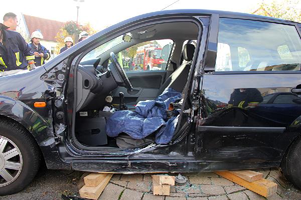 Bis zum Eintreffen des Rettungsdienstes übernahm ein Rettungsassistent der Feuerwehr die weitere Betreuung und medizinische Versorgung des verletzten Fahrers. An beiden Fahrzeugen wurden die Batterien abklemmt und der Brandschutz sichergestellt. Der Fahrer war glücklicherweise nicht in seinem Fahrzeug eingeklemmt, doch die Fahrertür ließ sich durch den Unfall nicht mehr öffnen. Da ein Aussteigen über die Beifahrerseite aufgrund der Verletzungen ausschied, wurde zusammen mit der inzwischen eingetroffenen Notärztin entschieden, eine Rettungsöffnung zur schonenden Rettung auf der Fahrerseite zu schaffen. Dazu wurde das Fahrzeug mit Hölzern stabilisiert und die Fahrzeugtür mit Spreizer und Schere abgetrennt.