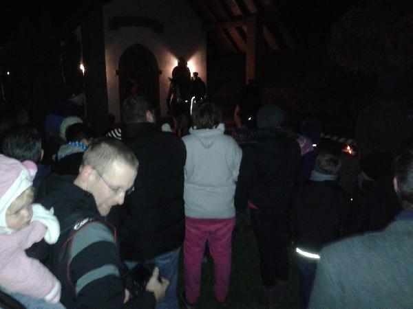 Nach dem die Martinsgeschichte vorgelesen wurde, wurde auch symbolisch der Mantel mit dem Bettler geteilt. Danach gingen alle wieder zurück ans Gerätehaus wo auf die mutigen kleinen Wanderer eine Martinsbrezel wartete. Im Laufe dieses Abends wurden dann auch die Gewinnnummern gezogen mit denen man Gänse oder Hähnchen gewinnen konnte.