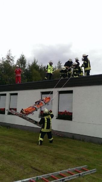 Im letzten Teil der Übung wurde simuliert, dass eine Person auf dem Dach des Wohnbereich 1 zusammengebrochen sei und sich Rücken- und Nackenverletzungen zugezogen hatte. Diese musste zuerst von Ersthelfern des DRK stabilisiert und erstversorgt werden, bevor er gemeinsam auf die Vakuummatratze umgebettet werden und mit Hilfe eines Leiterhebels vom Dach des Gebäude gerettet werden konnte.