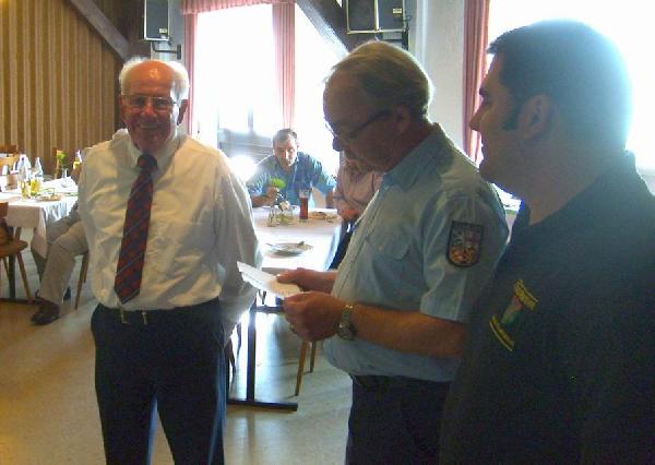 Löschbezirksführer Wolfgang Braun und sein Stellvertreter Andreas Groß überreichten Erwin Schäfer im Beisein der Kameradinnen und Kameraden des Löschbezirks Bubach-Calmesweiler ein Geschenk des Löschbezirks.