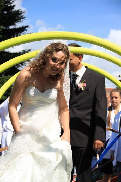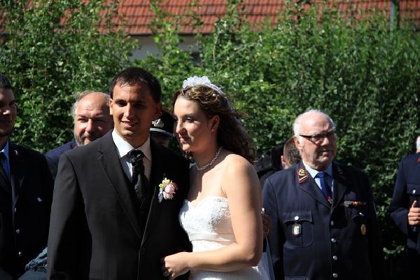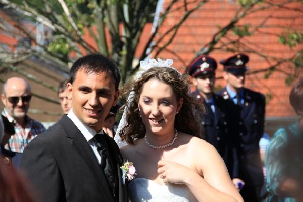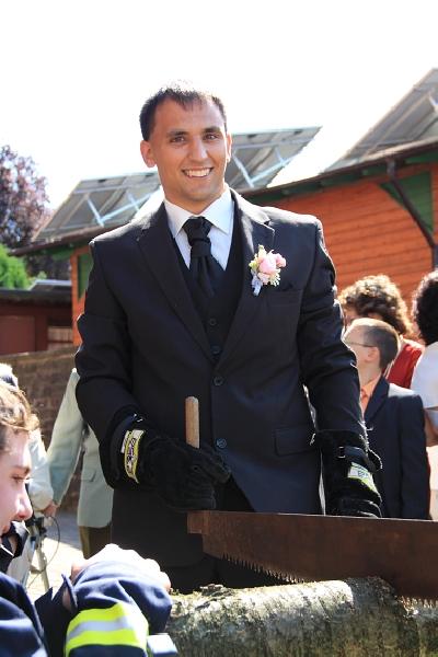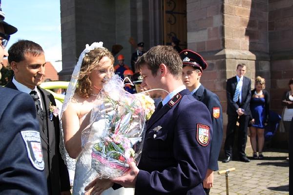 Aus diesem Grund trafen sich die Feuerwehrleute aus dem Löschbezirk Uchtelfangen, dem Simon angehört und die Kameraden aus Humes um dem Brautpaar zu gratulieren und ein paar Aufgaben zu stellen. Alle Feuerwehrangehörigen standen Spalier und führten so die frisch gebackenen Eheleute zu den einzelnen Stationen.