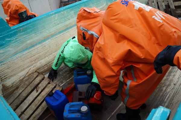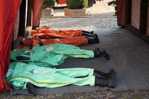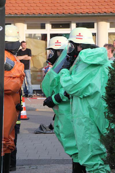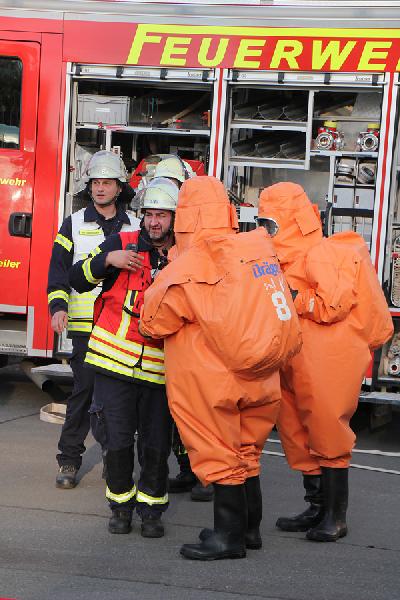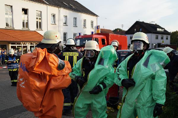 Wie bei solchen Lagen üblich, wird daraufhin zuerst der zuständige Löschbezirk Bubach-Calmesweiler alarmiert. Bei der Lageerkundung durch die ersten Kräfte ist schnell klar: Der rote Rauch ist kein normaler Brandrauch, sondern muss durch eine noch unbekannte Chemikalie in der mit Bauschutt beladenen Mulde verursacht werden. Während die Einsatzkräfte den Einsatzort weiträumig absperren und unter Atemschutzeinsatz nach betroffenen Menschen suchen, wird durch den Einsatzleiter der Gefahrstoffzug nachalarmiert.