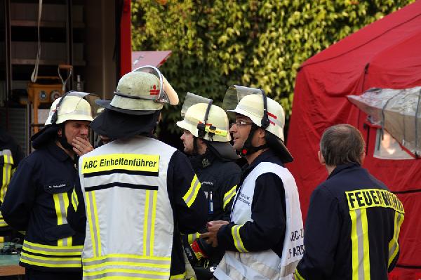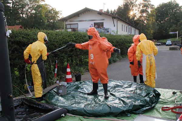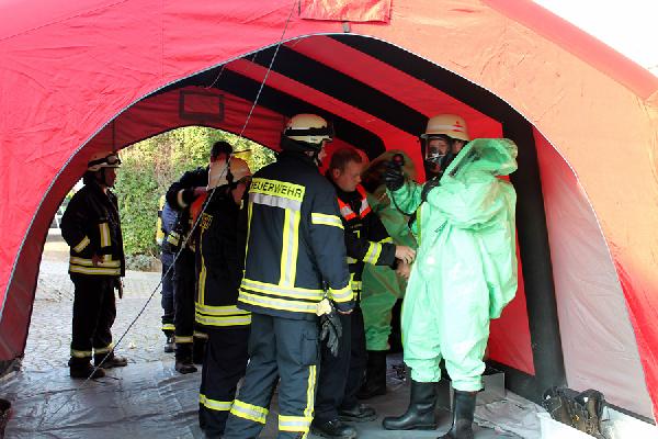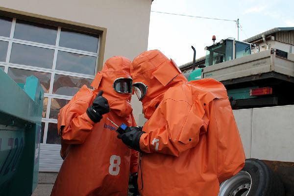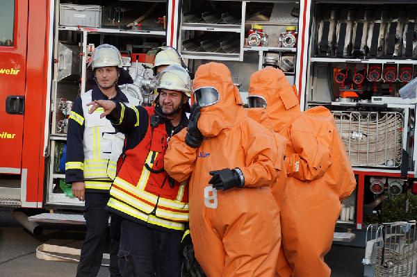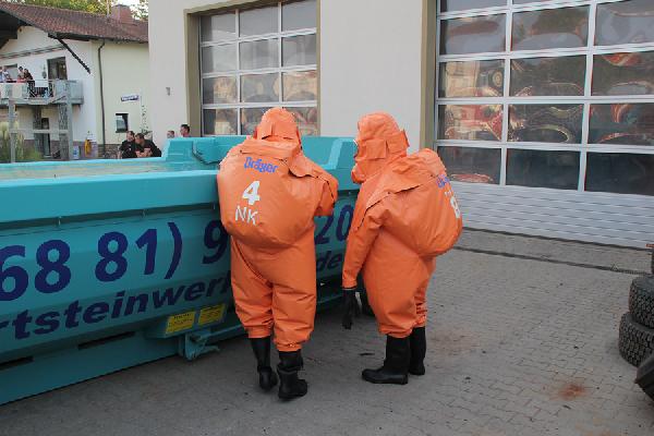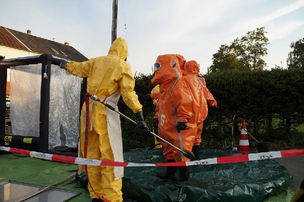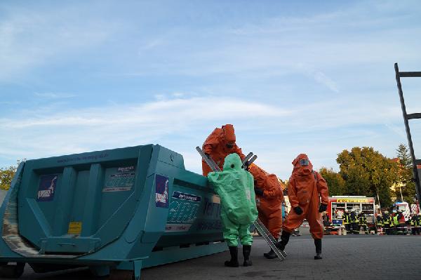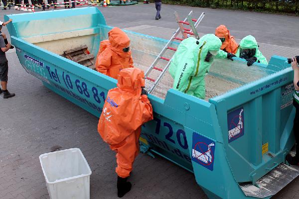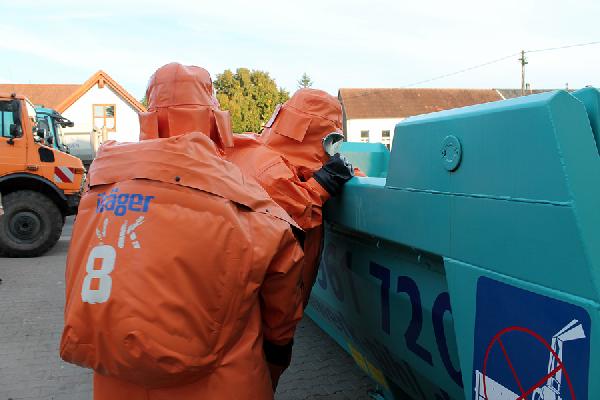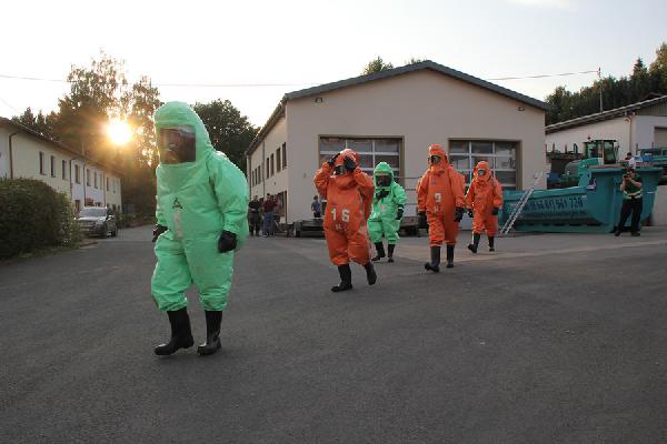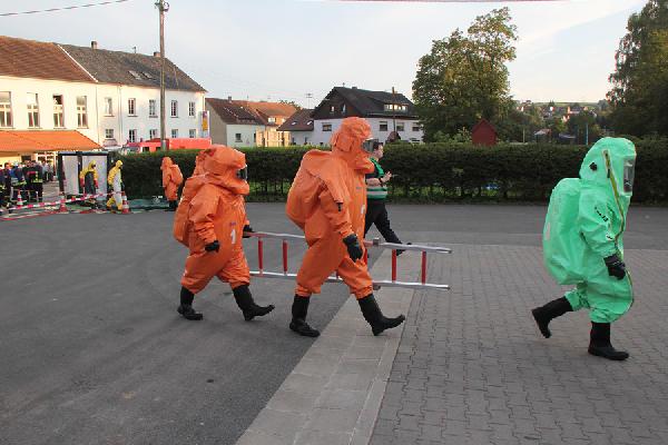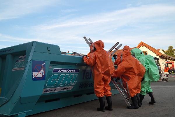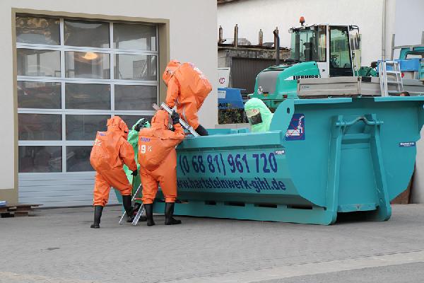 Bubach-Calmesweiler. Starke Rauchentwicklung aus einem Schuttcontainer: Mit einem ganz alltäglichen Einsatzszenario beginnt am Abend des 05. September 2014 die diesjährige Abschlussübung des Gefahrstoffzuges des Landkreises Neunkirchen. Am Abend, so das geplante Szenario, bemerkt der Inhaber eines Bauunternehmens in Bubach-Calmesweiler eine starke Rauchentwicklung aus einer beladenen Containermulde, die ein Mitarbeiter am Nachmittag auf dem Firmengelände abgestellt hatte. Da er weder das genaue Ausmaß noch eine Ursache erkennen kann, alarmiert er mit seinem Mobiltelefon die Feuerwehr.
