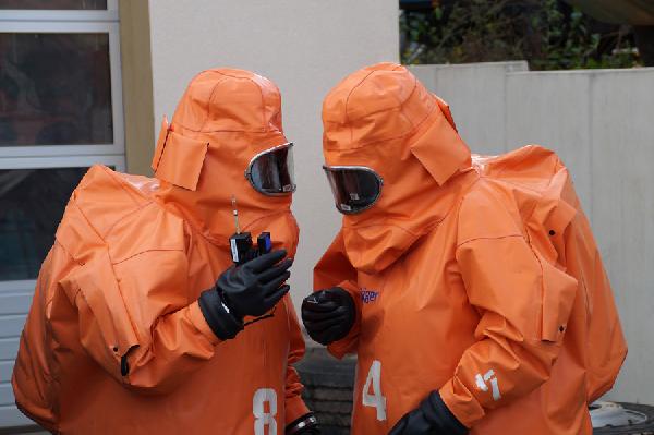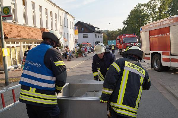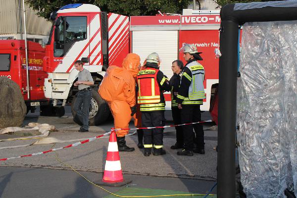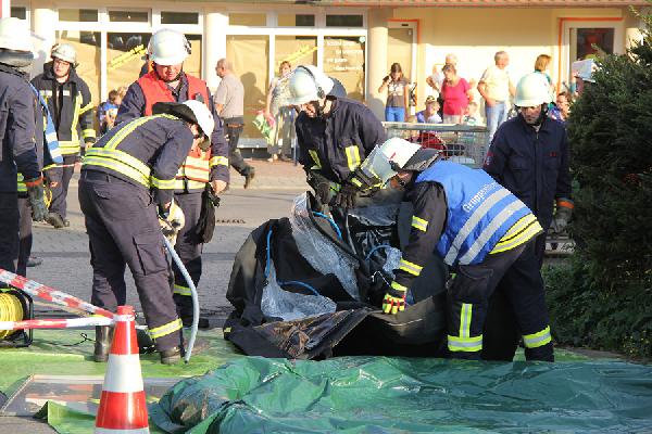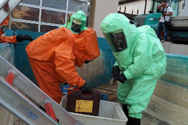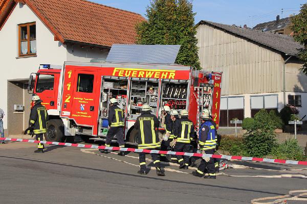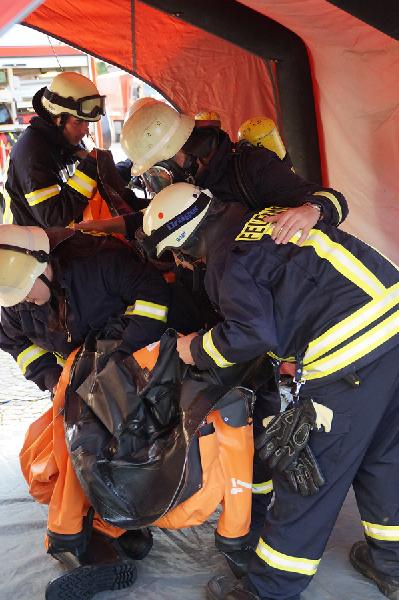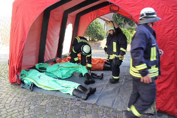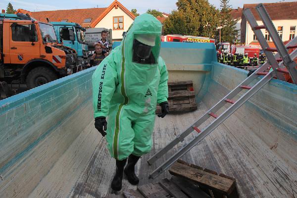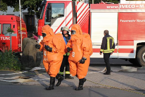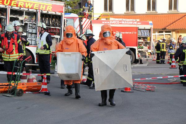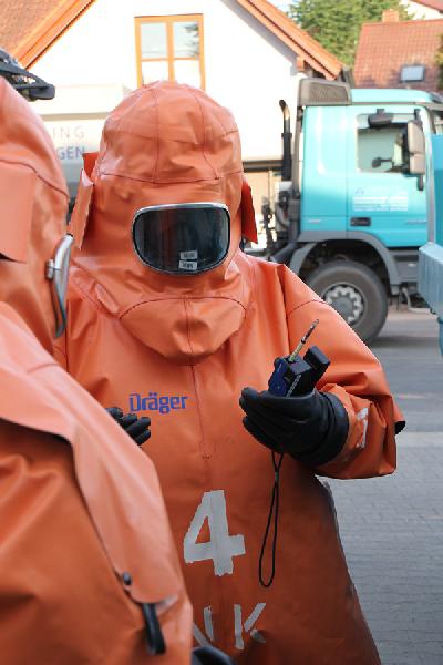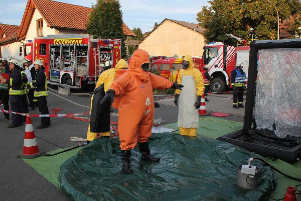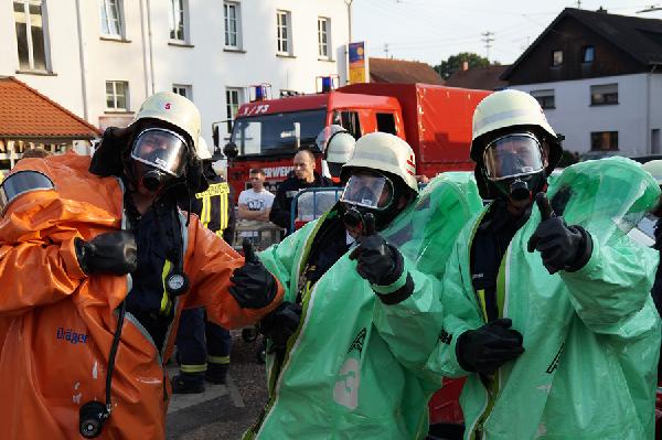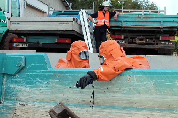 Bubach-Calmesweiler. Starke Rauchentwicklung aus einem Schuttcontainer: Mit einem ganz alltäglichen Einsatzszenario beginnt am Abend des 05. September 2014 die diesjährige Abschlussübung des Gefahrstoffzuges des Landkreises Neunkirchen. Am Abend, so das geplante Szenario, bemerkt der Inhaber eines Bauunternehmens in Bubach-Calmesweiler eine starke Rauchentwicklung aus einer beladenen Containermulde, die ein Mitarbeiter am Nachmittag auf dem Firmengelände abgestellt hatte. Da er weder das genaue Ausmaß noch eine Ursache erkennen kann, alarmiert er mit seinem Mobiltelefon die Feuerwehr.
