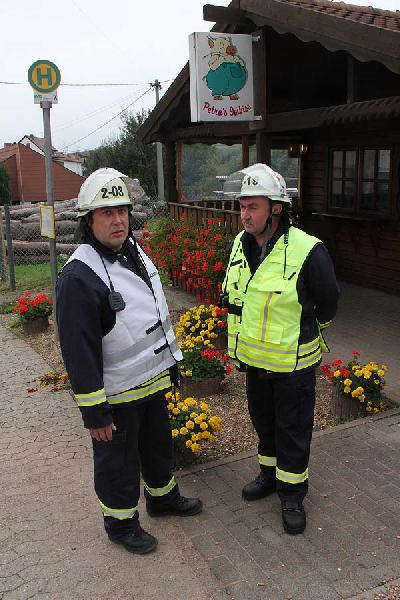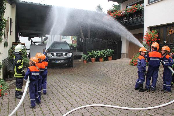 Das Antreten der Jugendfeuerwehr zum Abschluss der Übung ist in diesem Jahr jedoch buchstäblich ins Wasser gefallen, kurz nach dem Abbau der Geräte und Schläuche ergoss sich ein heftiger Regenguss über die Ortsmitte von Bubach.