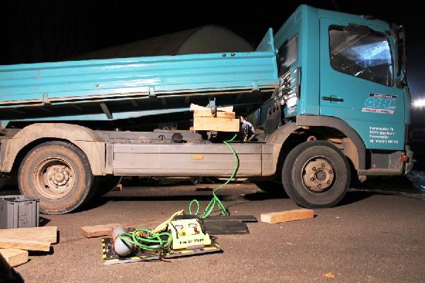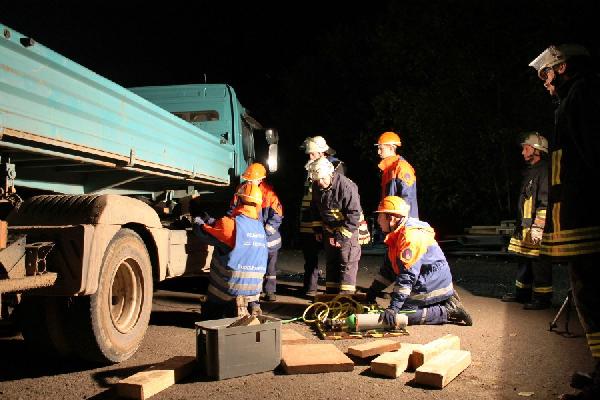Ein vierter Arbeiter wurde beim Abladen von Baumaterialien zwischen Kipper-Mulde und Fahrgestell eines LKW eingeklemmt. Die Person wurde von den Jugendlichen professionell unter Einsatz von Hebekissen befreit und gerettet.