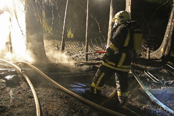 Über rund 300 Meter mussten die Einsatzkräfte eine Schlauchleitung querfeldein bis zur abgelegen und nur zu Fuß zugänglichen Einsatzstelle verlegen. Mit zwei C-Rohren und ausgerüstet mit unter Atemschutz konnten die Einsatzkräfte das Feuer löschen, aber nicht verhindern, dass die Hütte komplett niederbrannte. Auch die in unmittelbarer Nähe stehenden Bäume wurden durch die Hitze des Feuers in Mitleidenschaft gezogen. Ein weiteres Ausbreiten der Flammen konnte aber durch den schnellen Einsatz verhindert werden.