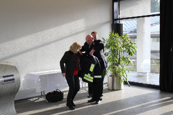 Eine kleine Überraschung gab es noch: Damit Bürgermeisterin Müller-Closset als Chefin der Feuerwehr künftig an Einsatzstellen korrekt gekleidet ist, überreichte ihr Wehrführer Theis zum Schluss noch eine eigene Einsatzjacke.