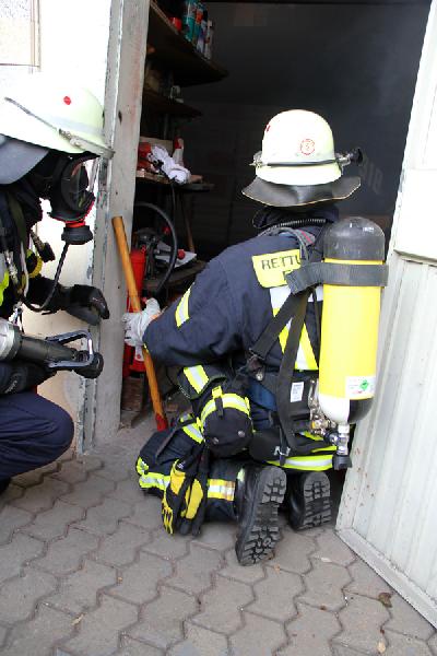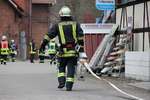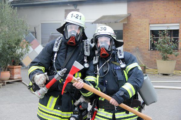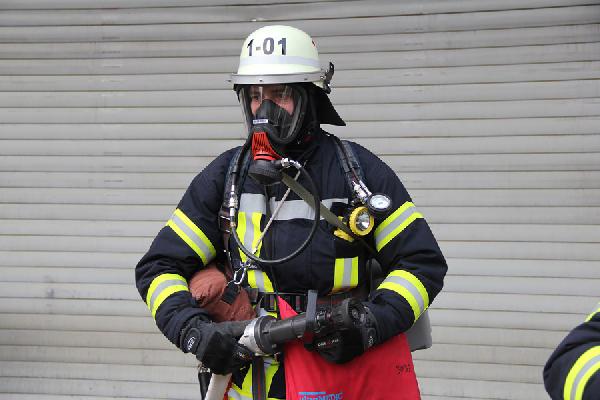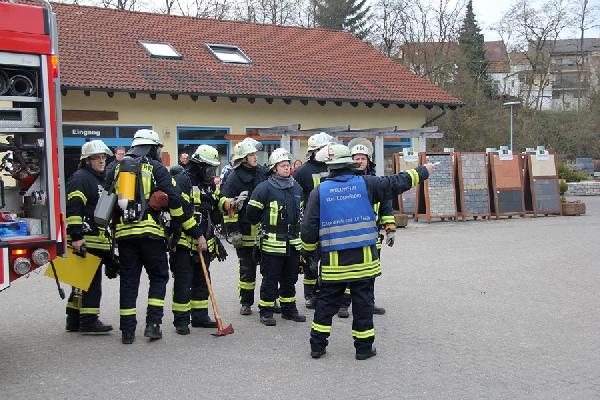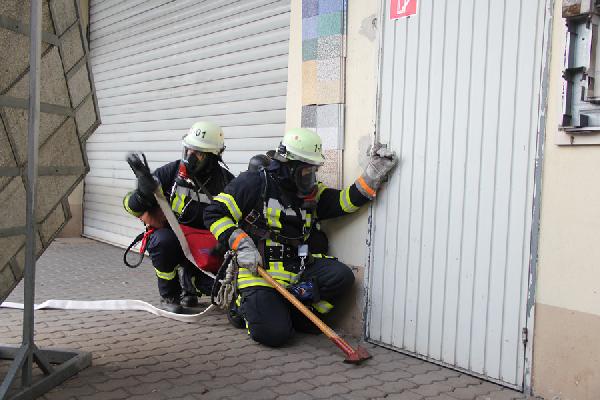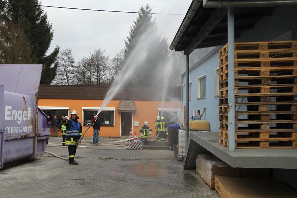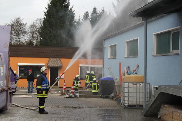 In einer Gewerbehalle war nach den Vorgaben der Übungsleitung ein Brand ausgebrochen, mehrere Personen sollten sich noch in dem Gebäude aufhalten. Mit Atemschutzgeräten ausgerüstet beginnen die ersten Trupps mit der Suche. Gleichzeitig wird vor dem Gebäude die Wasserversorgung aus einem Hydranten aufgebaut.