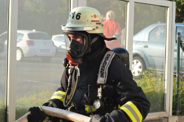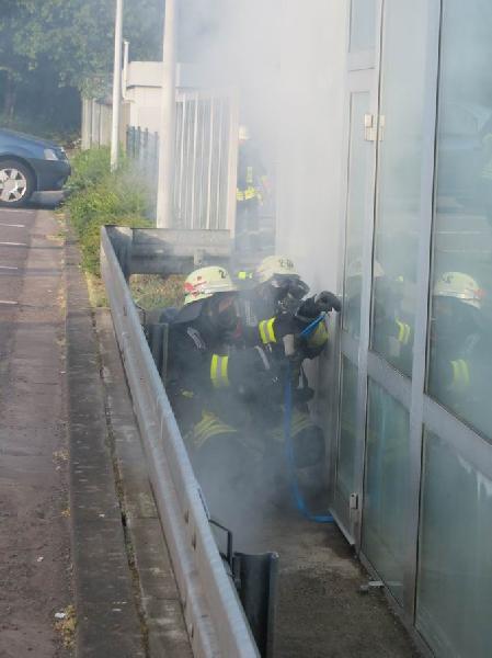 Beide Fahrzeuge des Löschbezirkes machten sich auf den Weg zu der besagten „Einsatzstelle“. Die Besatzung des Fahrzeuges HLF 8/12 positionierte sich im Bereich der Zufahrt zur Waschanlage und hatte die Aufgabe, erstmals mit einem Trupp unter schwerem Atemschutz zur Erkundung in die durch mittels Nebelmaschine stark verrauchte Waschhalle vorzugehen und den angenommenen Brand zu löschen. Unterstützend folgte ein zweiter Trupp unter Atemschutz in das Innere der Waschhalle. Da die Tore zu der Waschhalle nicht geöffnet werden konnten, war der einzige Zugang eine Tür an der Seitenwand.