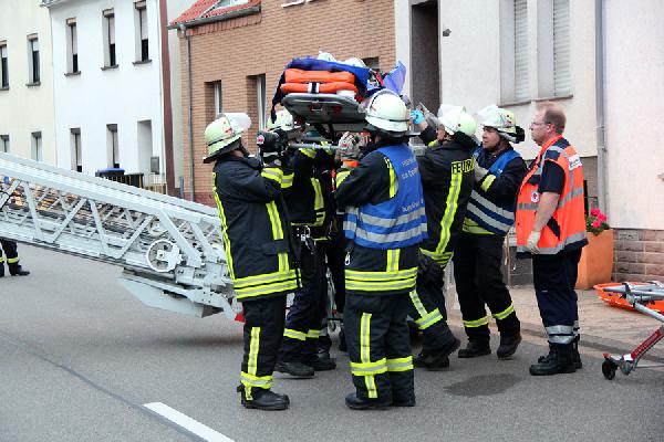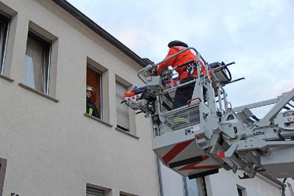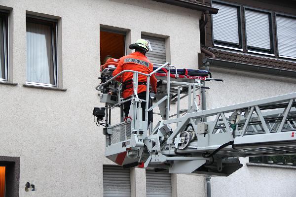 Da ein Transport über das enge Treppenhaus nicht möglich war, wurde zusätzlich zur Feuerwehr aus Eppelborn und Hierscheid die Drehleiter aus Lebach zur Einsatzstelle geschickt. Über ein Fenster konnte der Patient auf die vorbereitete Trage am Korb der Drehleiter gelagert und nach unten verbracht werden.