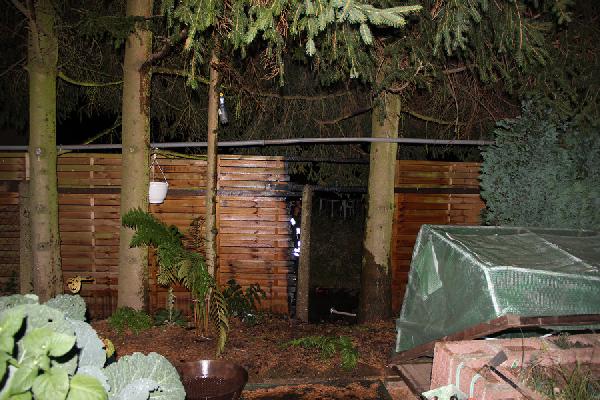 Dem Besitzer des Grundstücks gelang es, noch vor dem Eintreffen der Feuerwehr den Entstehungsbrand zu löschen. Die Einsatzkräfte kontrollierten die Einsatzstelle und wässerten aufgrund der großen Trockenheit den kompletten Bereich um die Einsatzstelle sowie die darüber befindliche Tannenhecke.