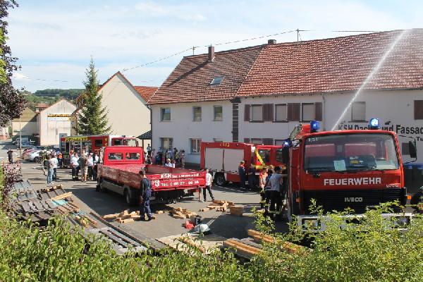 Pünktlich um 16:00 Uhr wurde Großalarm für die Gemeindejugendfeuerwehr ausgelöst. Der zuerst eingetroffene Löschbezirk Dirmingen begann sofort mit der Brandbekämpfung am Getränkemarkt und schirmte das Holzlager der Firma KSH Dach- und Fassadenbau ab.