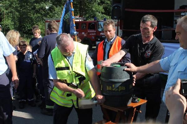 Zum Schluss durfte Guido Kuhn noch den Fassanstich zur offiziellen Eröffnung der Tage der offen Tür im Löschbezirk Dirmingen vornehmen, der gekonnt gemeistert wurde.