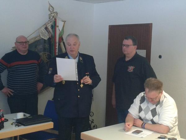 Eine besondere Ehrung konnte der Kreisbrandinspekteur durchführen. Hauptfeuerwehrmann Rainer Weber wurde für 35 Jahre Feuerwehrangehörigkeit mit dem goldenen Ehrenkreuz des Saarlandes ausgezeichnet. Unter großem Applaus seiner Feuerwehrkameraden nahm Rainer Weber die Ehrung entgegen. Rainer Weber, ein sehr engagierter Feuerwehrmann, leistet wichtige Arbeit im Löschbezirk. Er ist Vorstandsmitglied und arbeitet auch in der Schlauchwerkstatt in Eppelborn aktiv mit.