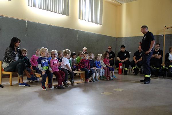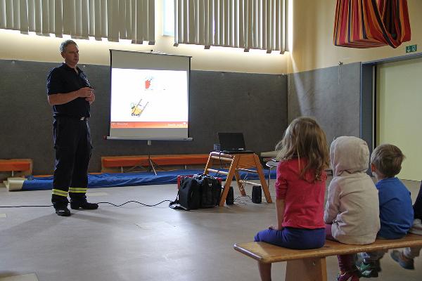 Löschbezirksführer Bruno Paul und seine Helfer erklärten den Kindergartenkindern kindgerecht, was sie tun müssen, wenn sie ein Feuer entdecken: Zum Beispiel einen Erwachsenen zu rufen oder auch schon selbst den Notruf zu wählen. Mit den Erzieherinnen wurde besprochen, welche Notausgänge zur Verfügung stehen und wo sich die Sammelplätze befinden.