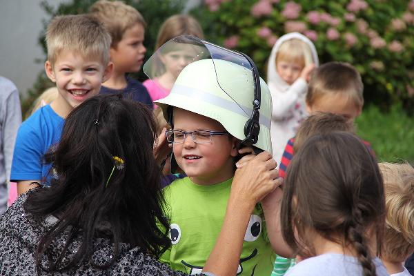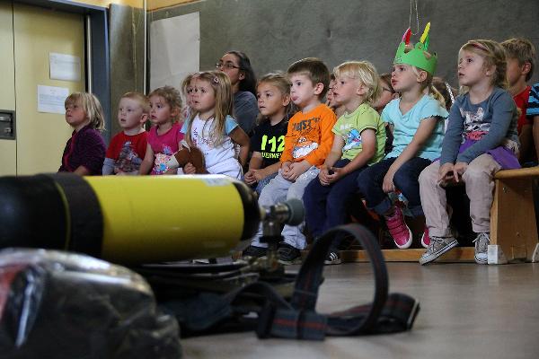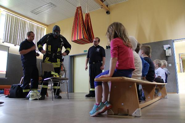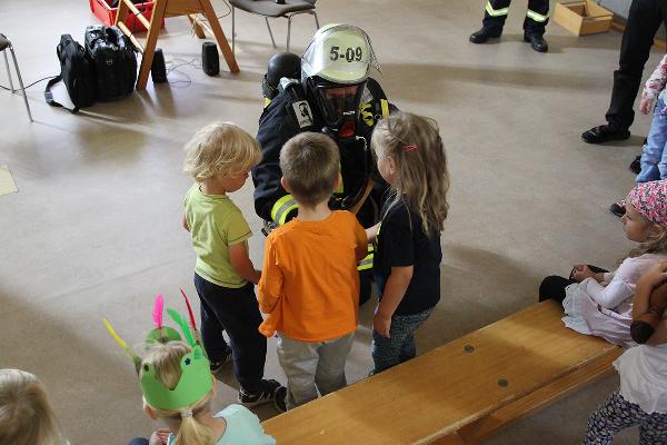 Wenn die Feuerwehr zu einem Brandalarm anrückt, rüsten sich die Feuerwehrleute mit Atemschutzgeräten und vielen Hilfsmitteln wie Axt oder Lampe aus. Um den Kindern die Angst vor den dermaßen "verkleideten" Rettern zu nehmen, durften die Kleinen einen voll ausgerüsteten Feuerwehrmann auch einmal aus der Nähe bestaunen und anfassen.