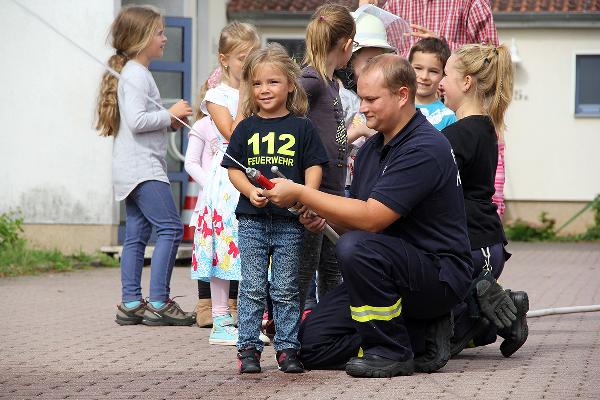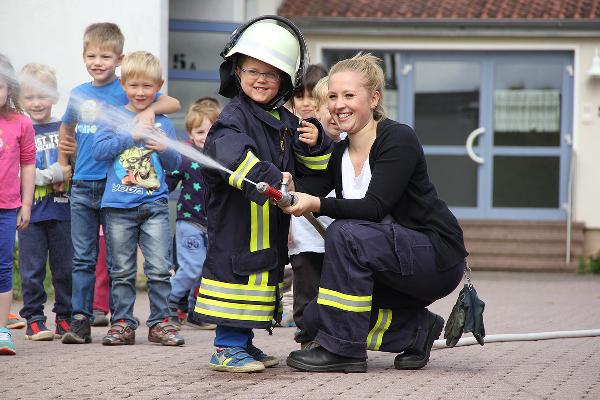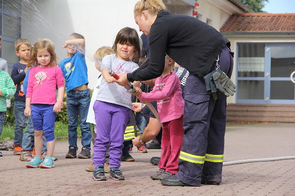 Bei der anschließenden Räumungsübung konnten Erzieher und Kinder dann beweisen, dass sie im Ernstfall einen kühlen Kopf bewahren und das Gebäude schnell und sicher verlassen können. Und damit es nicht bei der trockenen Theorie blieb, durften die Kinder schließlich auch selbst einmal mit dem großen Wasserschlauch spritzen.