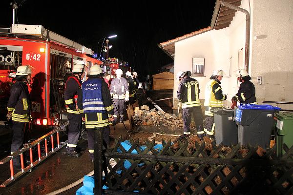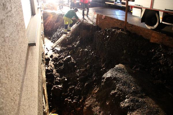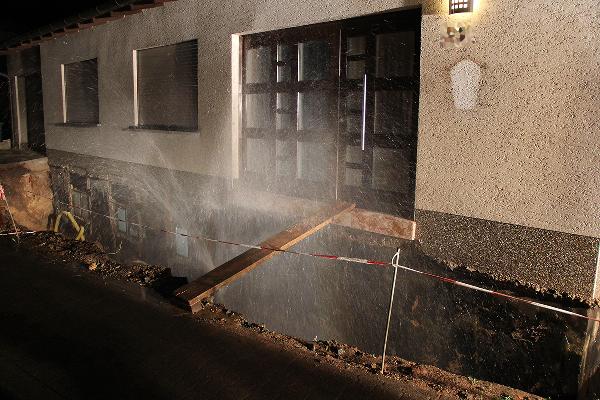 Beim Eintreffen der Einsatzkräfte aus den Löschbezirken Humes und Wiesbach waren nahezu alle Räume der Wohnung überschwemmt, zum Teil stand das Wasser bis zu 10cm hoch in den Wohnräumen. Während Mitarbeiter des Wasserversorgers die Leitung zum betroffenen Straßenabschnitt absperrten, begann die Feuerwehr damit, die Kellerwohnung und die Baugrube mit Tauchpumpen trockenzulegen. Die Anschlussleitung wurde abgetrennt und bis zur Reparatur am Folgetag mit einer Blindkappe verschlossen.