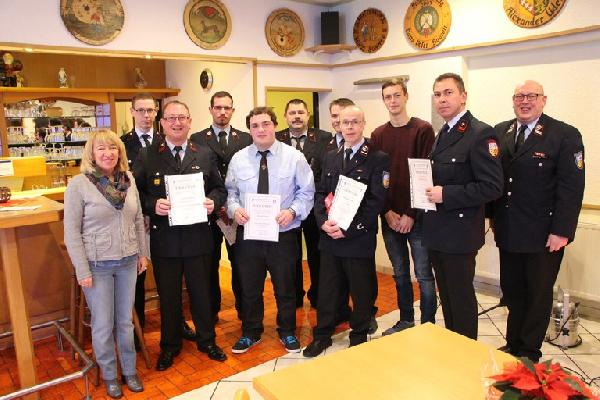 Aus der Jugendwehr übernommen wurde Jan Knobe. Außerdem konnte sich David Riehm über die Beförderung zum Feuerwehrmann freuen. Dominik Hoffmann ist zum Oberfeuerwehrmann aufgestiegen. Vom Oberfeuerwehrmann zum Hauptfeuerwehrmann wurde Mario Firmbach befördert. Benedikt Hans hat ab jetzt den Rang eines Löschmeisters inne. Zum Brandmeister befördert wurde der stellvertretende Löschbezirksführer Patrick Hoffmann.