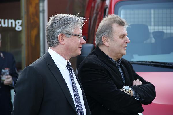 Mit rund einer Stunde Verspätung konnte die Fahrzeugübergabe dann doch noch stattfinden. Müller-Closset nahm die Fahrzeugschlüssel für den neuen Kommandowagen, ein Mannschaftstransportfahrzeug und ein Mehrzweckfahrzeug von Peter Hammerschmitt, dem Geschäftsführer der "Auto Galerie Saar" in Empfang und reichte sie gleich weiter an die Löschbezirksführer von Eppelborn und Hierscheid sowie an Wehrführer Klaus Theis.