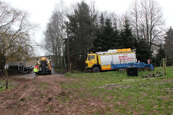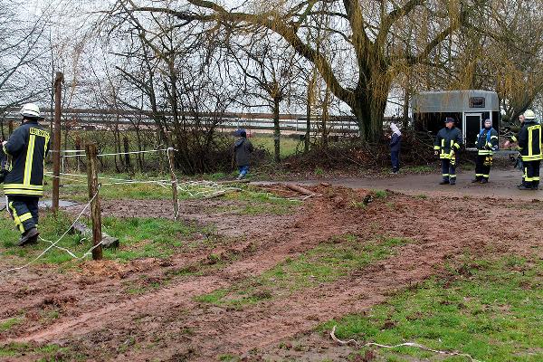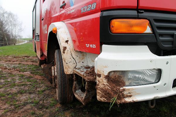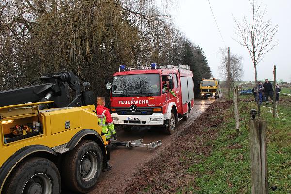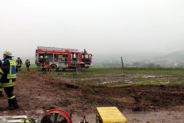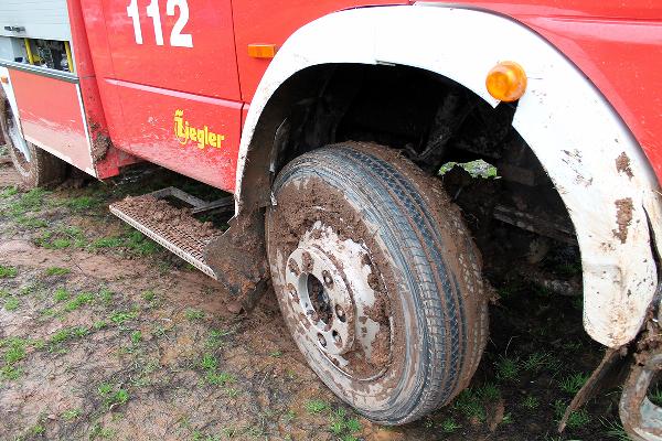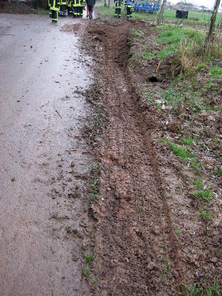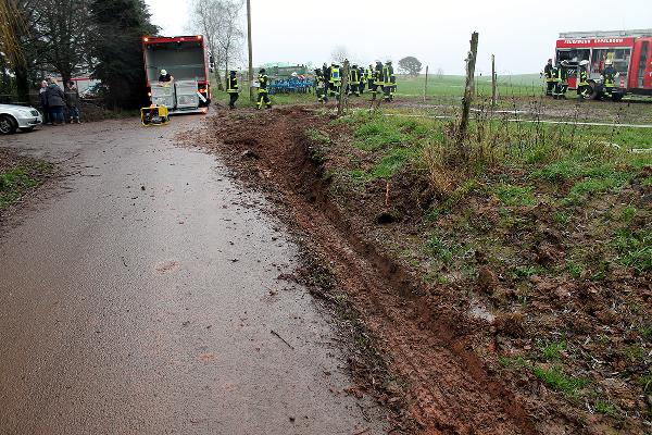 In Höhe des Berghofes musste der Fahrer des rund 14 Tonnen schweren Einsatzfahrzeugs Ästen ausweichen und kam dabei mit den Rädern auf den Seitenstreifen. Dort waren vor Kurzem erst die Leitungen zur neuen Windenergieanlage verlegt worden und man hatte es offenbar versäumt, das wiederverfüllte Erdreich fachgerecht zu verdichten. Deshalb sackte das Löschfahrzeug ein und geriet ausser Kontrolle. Der Fahrer reagierte richtig und versuchte, das Fahrzeug auf den angrenzenden Acker zu lenken. Er konnte damit verhinderten, dass das mit neun Einsatzkräften besetzte Einsatzfahrzeug umkippte.